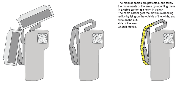 Monitors are a central part of many operator chairs, and often the user must change between working based on monitor feedback and based on viewing whats in front. Monitors, however, have important ergonomic guidelines to them. When working in front of a monitor for more than a few seconds, any viewing angle outside the 60-90° forward cone induces discomfort in both neck, back and eyes. Therefore, a good way to change the positions of one or two monitors is an advantage for the user.